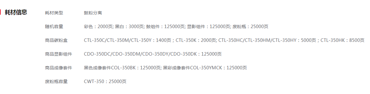 耗材型号  :   CTL-350C/CTL-350M/CTL-350Y 1400页 CTL-350K 2000页 CTL-350HC/CTL-350HM/CTL-350HY 5000页 CTL-350HK8500页